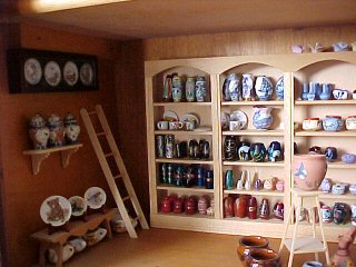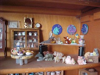 'Upstairs' are the ornaments and a selection of fancy teapots - the kind that aren't ever used, but displayed as a collection. Some of these ornaments are fairly large (for a dollshouse) but are in scale for the kind of large porcelain sit-on-the-floor china dogs, etc, that some people have. Some of these large items came out of Christmas crackers - for non-Brits, a UK tradition at Christmas, expecially in families with young children, is to have crackers with Christmas dinner. These are basically tubes of paper with a strip of paper running through which, when pulled into two bits, gives a 'crack', hence the name 'cracker'. Two people pull the cracker, which tears into two. Inside there is a variety of things, depending on how expensive the cracker has been, and each cracker in the box (of 6 or 12) is different; but there's always a paper hat, a slip of paper on which is printed a silly joke, and a toy, mini ornament or - occasionally - something useful; one make of cracker has in them a mini screwdriver, a mending kit containing a needle and some mixed thread, a mini pack of cards, things like that. For four years my cousin got animal crackers, and as a result the china shop carries a dolphin, a bison, an armadillo and a pig, each of which, in full scale, would be about two feet long. In addition, one of the dolls house shops seems to stock some 1/10 scale items, rather than 1/12, and it's possible to buy from them (mail order) something that's not quite in scale for a regular setting; but these can fit into the china shop, too. |